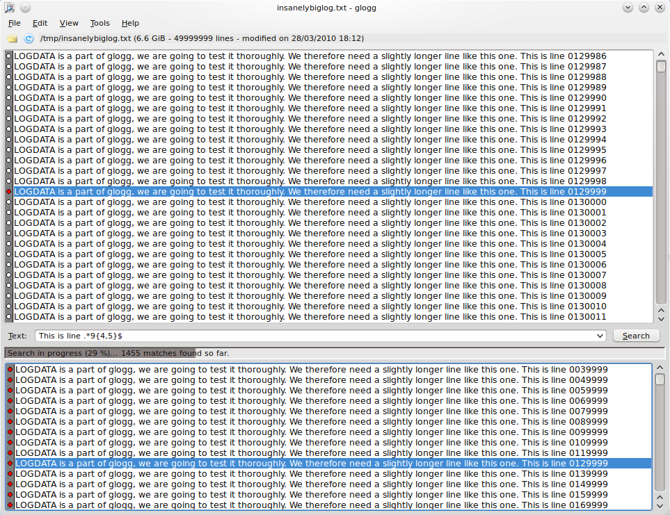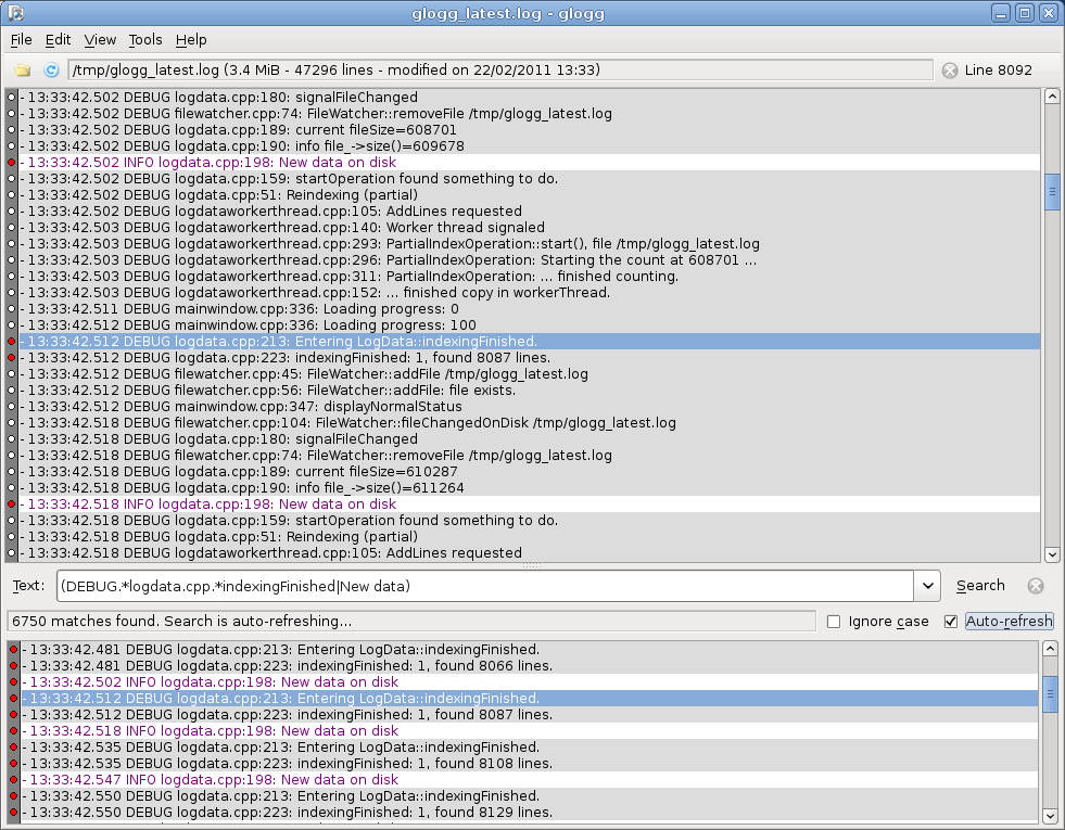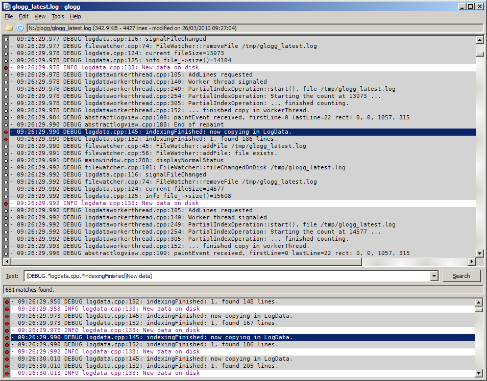 glogg 0.6 displaying it's own log on WinXP | Searching through a respectably sized log on Kubuntu 9.10 |