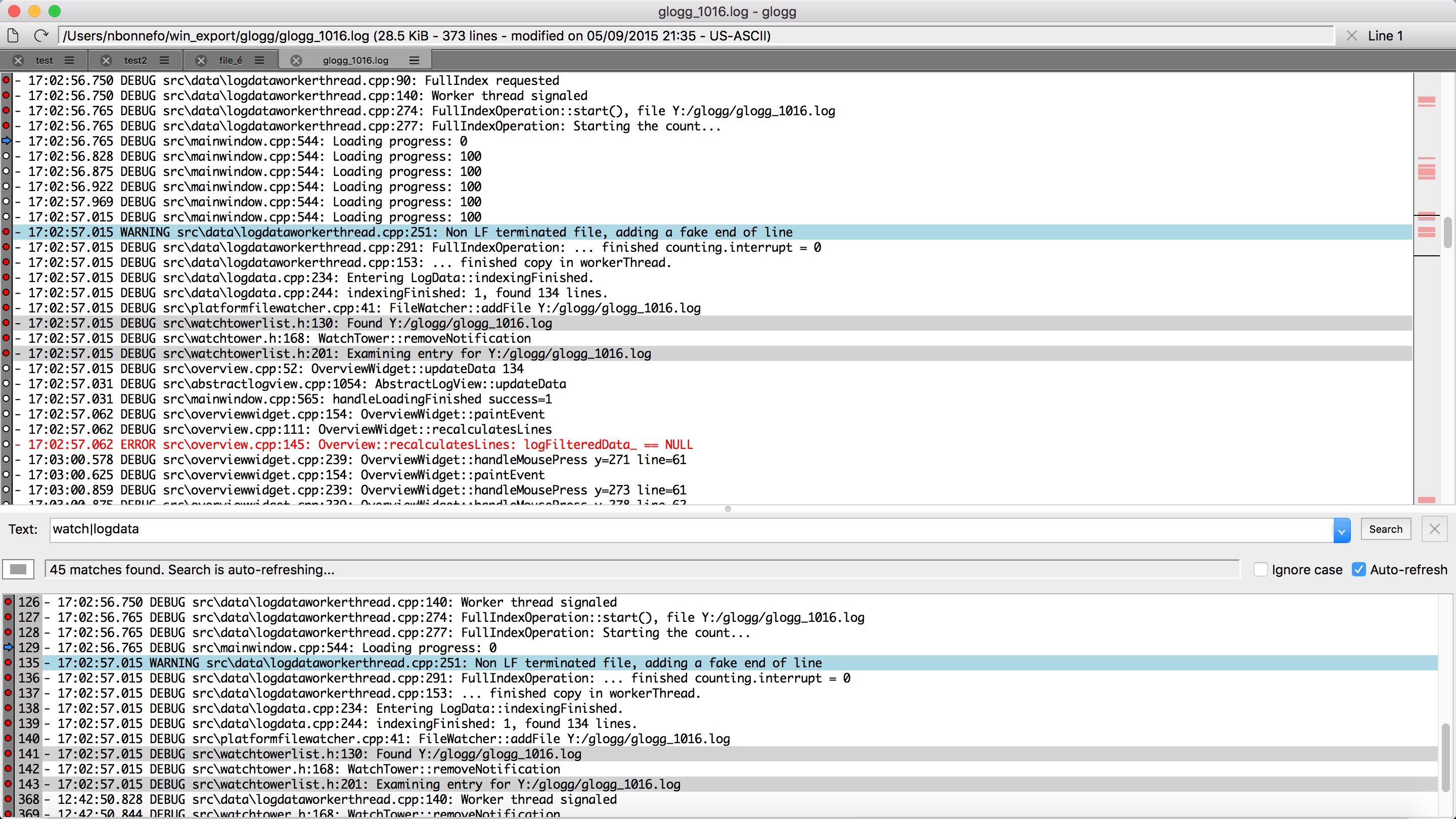 glogg 1.1.2 on Mac OSX 10.11 and a high resolution display | glogg 0.8.3 on Debian sid |